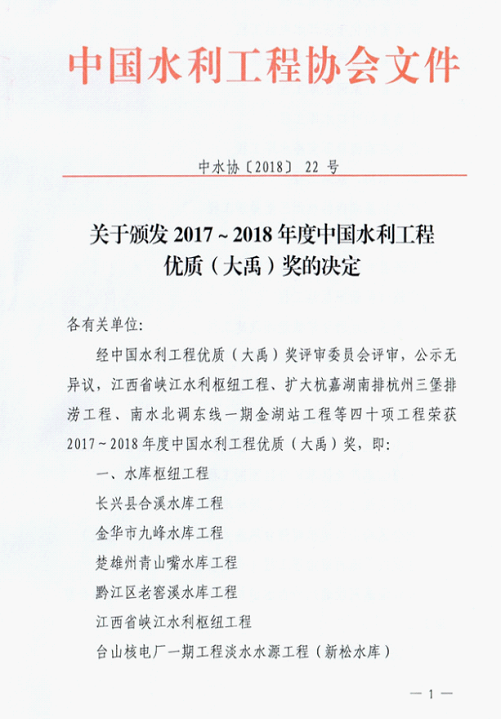 该奖项是水利工程行业优质工程的最高奖项。此次获奖,对公司市场投标信用等级的提升有积极作用,更为公司“二次创业再起步”增强了市场竞争力和激发了全体员工干事创业的精神动力。