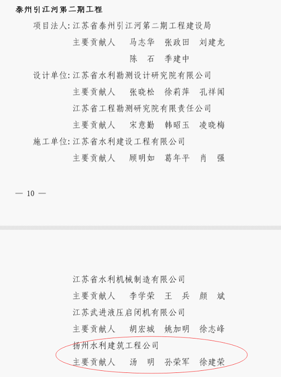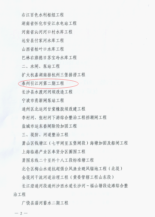 2018年12月27日,扬州水利建筑工程公司承建的泰州引江河二期工程荣获“2017—2018年度中国水利工程优质(大禹)奖”。