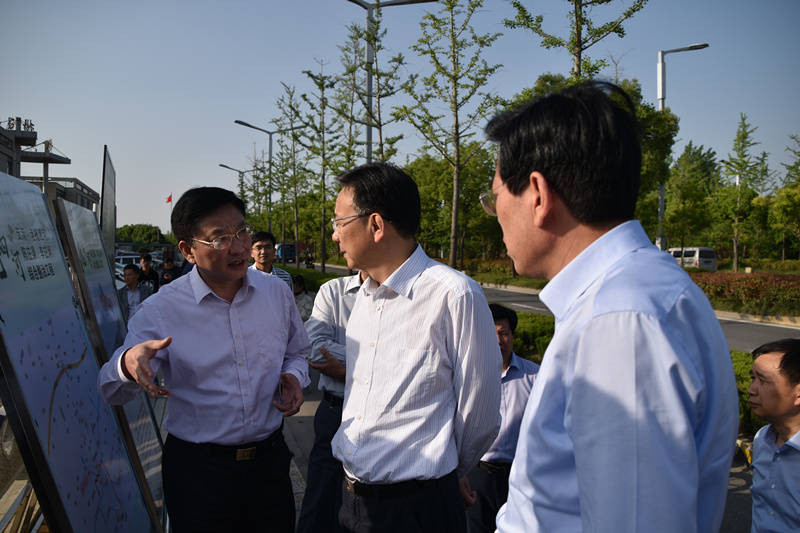 夏市长一行视察了槐泗河干河、支河老人沟、干河中、下游段,并详细听取了集团董事长徐渊关于槐泗河先导段建设进度和二期工程进展情况的介绍。