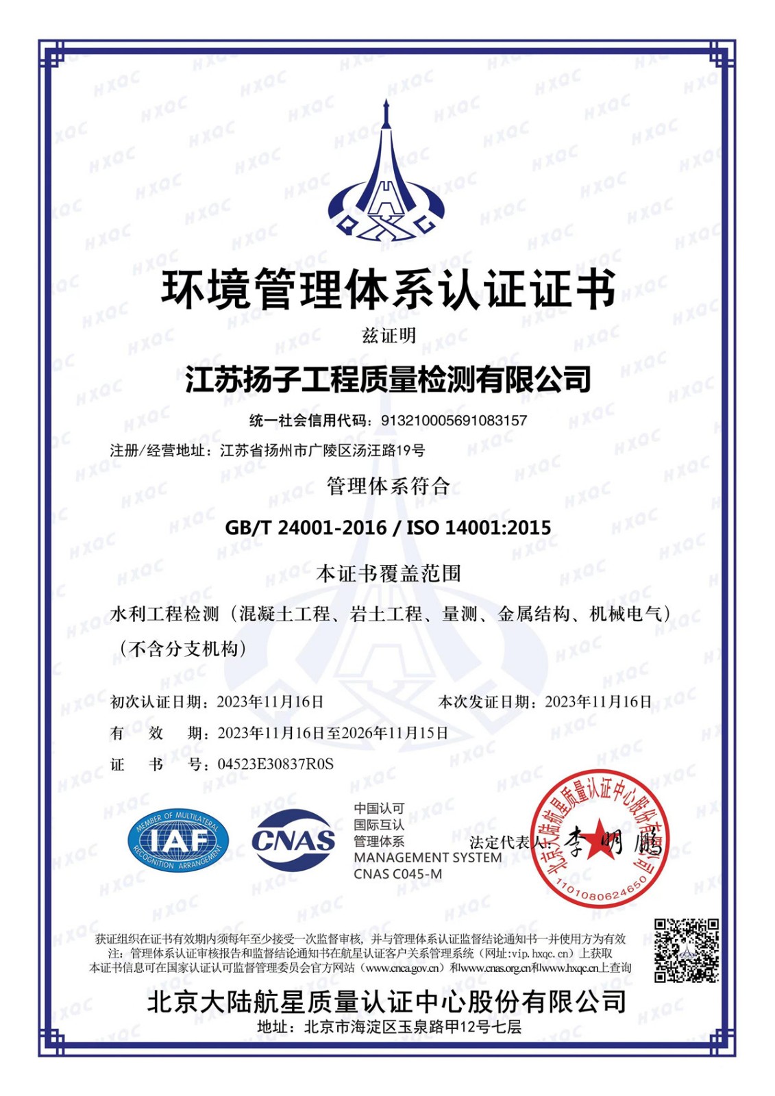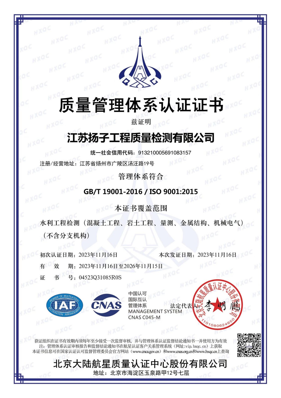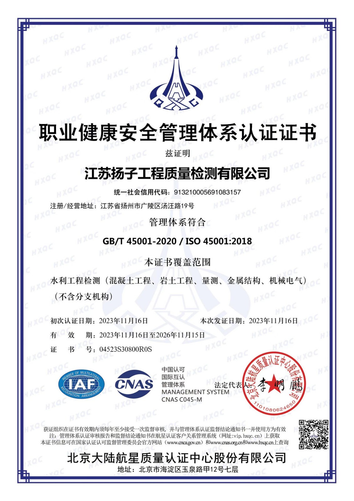 近日,江苏扬子工程质量检测有限公司获得了“ISO 9001质量管理体系”、“ISO 14001环境管理体系”、“ISO 45001职业健康安全管理体系”认证证书,公司规范化管理及风险管控迈上了一个新台阶。